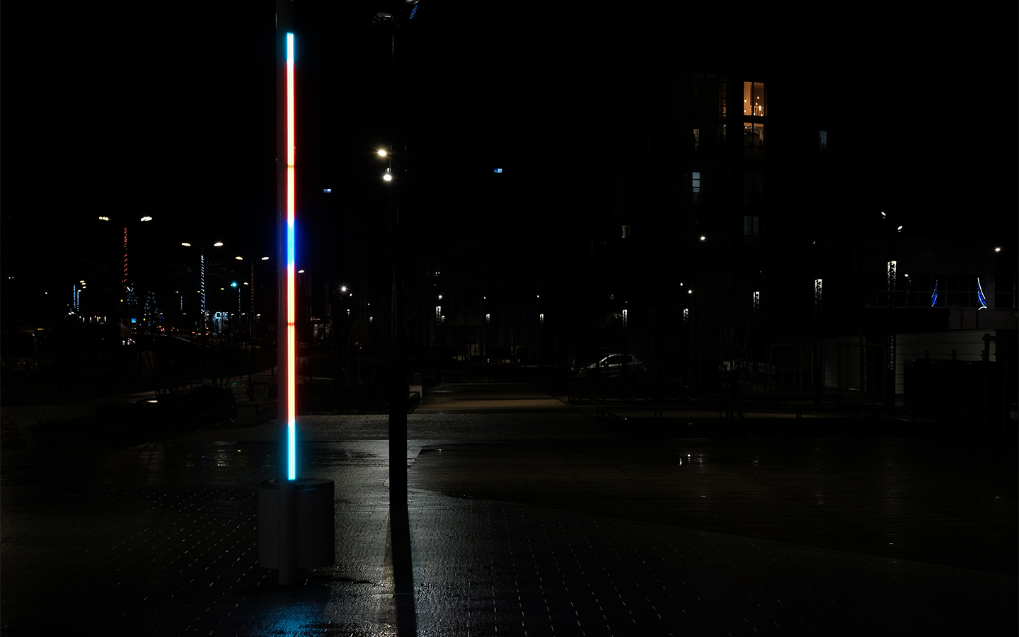 Flux is a set of 2 steles of brushed stainless steel standing 3 meters high in the center of the Mail Leser ; At nightfall, the sculpture takes on a new development, the rays of the sun give way to a play of light that runs through its surface in remarkable fluidity, embracing its slightest roughness and relief in sublime iridescence.